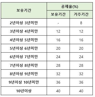 유의할점은 보유기간 중 거주기간이 2년 이상일 경우에만 1가구 1주택 공제율을 적용 받을 수 있습니다